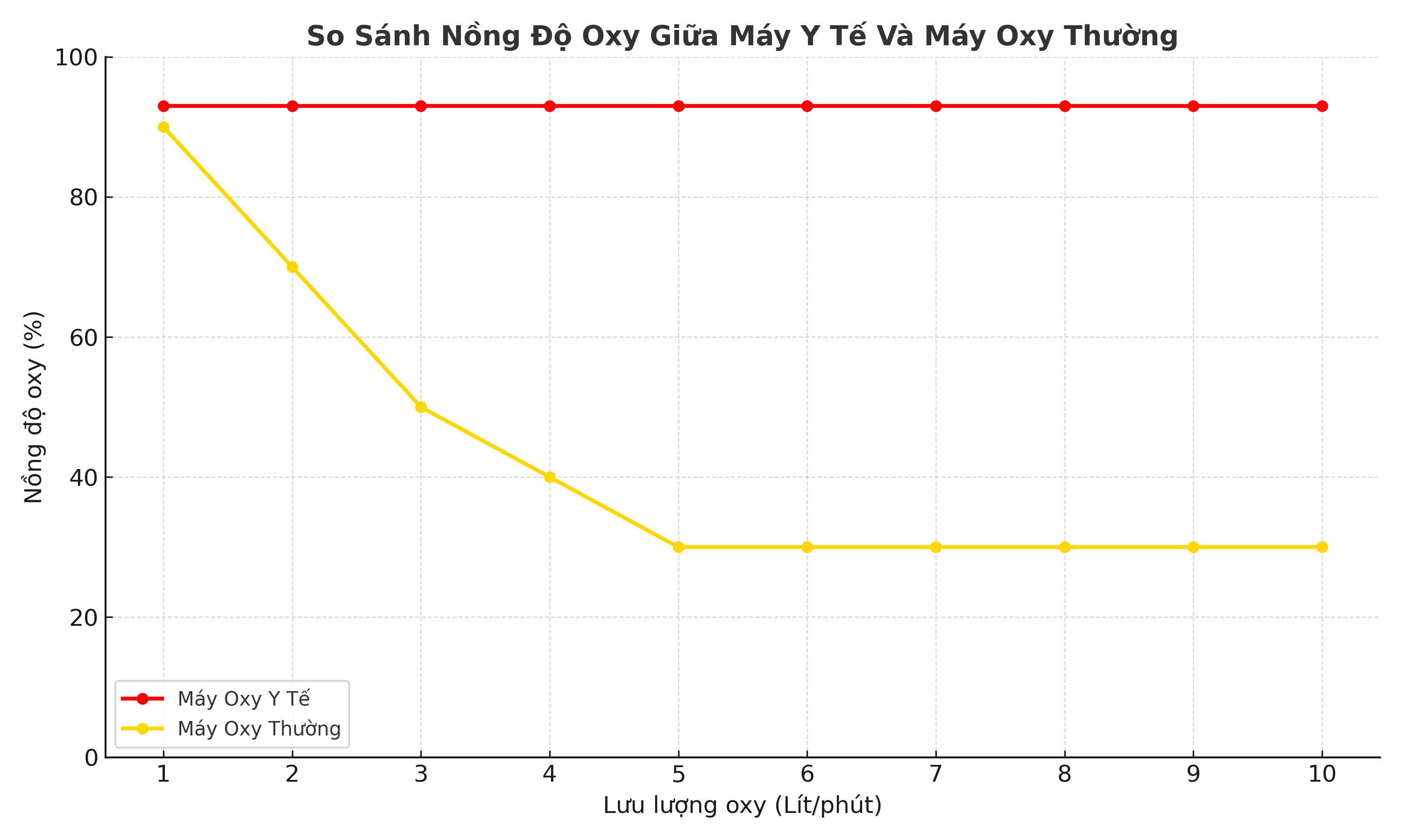 Máy đạt tiêu chuẩn y tế phải duy trì mức ≥ 90% cho dù ở bất kỳ mức công suất nào của máy.