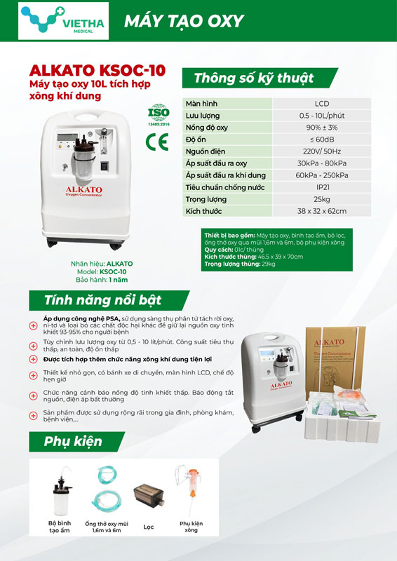 Máy tạo oxy Alkato KS5 được chế tạo có kèm xông khí dung để cung cấp được 5 lít oxy tinh khiết cao đến 93% (±3%) chỉ trong 1 phút bằng công nghệ hấp thụ xoay áp suất sàng phân tử (PSA) hiện đại. Thiết bị áp dụng công nghệ của Nhật Bản. Chuyên sử dụng cho các bệnh nhân suy hô hấp, tắc nghẽn phế quản phổi COPD,...và cũng là thiết bị đang được sử dụng để điều trị các bệnh nhân nhiễm COVID-19.