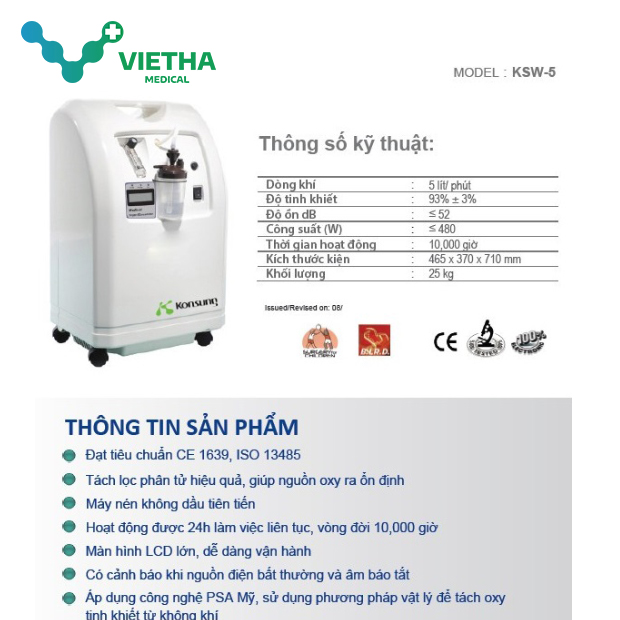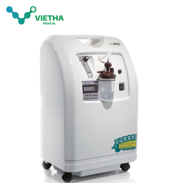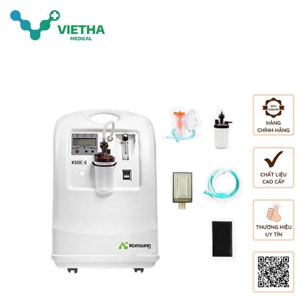 Máy tạo oxy Konsung KSOC-5 được chế tạo có kèm xông khí dung để cung cấp được 5 lít oxy tinh khiết cao đến 93% (±3%) chỉ trong 1 phút bằng công nghệ hấp thụ xoay áp suất sàng phân tử (PSA) hiện đại. Thiết bị áp dụng công nghệ của Nhật Bản. Chuyên sử dụng cho các bệnh nhân suy hô hấp, tắc nghẽn phế quản phổi COPD,...và cũng là thiết bị đang được sử dụng để điều trị các bệnh nhân nhiễm COVID-19.