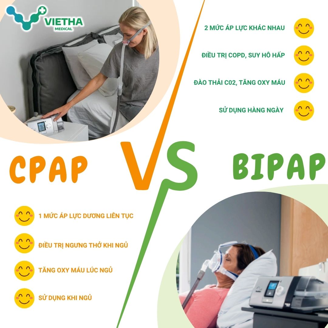 | Áp lực khí | Duy trì 1 mức áp lực ổn định | Có 2 mức áp lực: hít vào (IPAP) và thở ra (EPAP) |