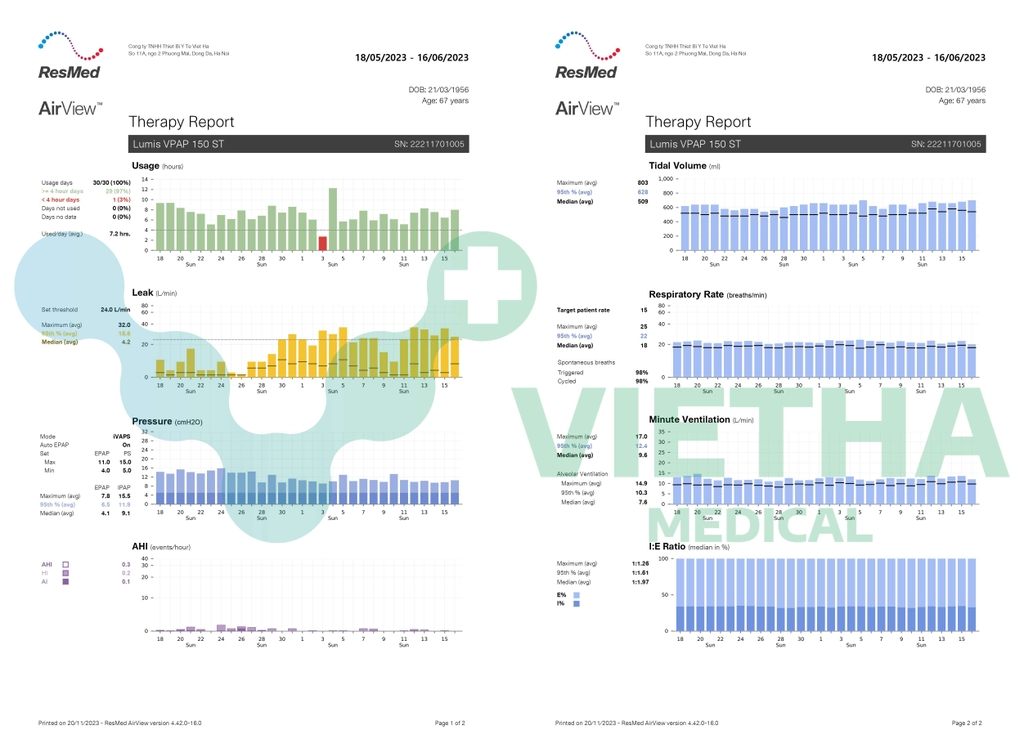 Sau mỗi đêm sử dụng, ResMed Lumis 150 sẽ báo cáo kết quả nhịp thở trên màn hình của máy hoặc trong phần mềm MyAir mà nhà sản xuất đã thiết lập. Báo cáo sẽ đầy đủ các chỉ số: Thời gian sử dụng máy, lượng khí thở ra hít vào, độ xì khí mặt nạ, áp lực khí trung bình, tốc độ thở, chỉ số ngưng giảm thở (AHI), áp lực thở ra hít vào, thể tích không khí,...