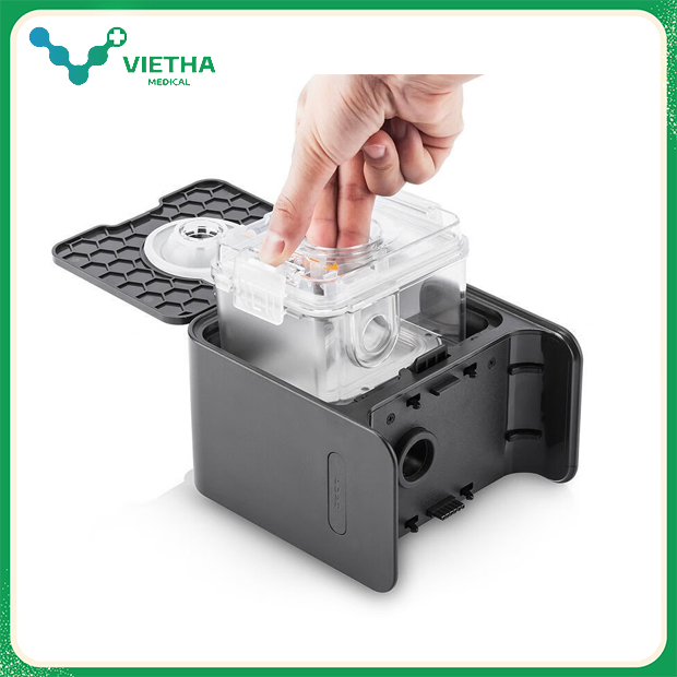 Máy đi kèm bình làm ẩm nhiệt độ có thể điều chỉnh 5 mức, chống khô họng và mũi – một nhược điểm thường gặp khi dùng máy thở thời gian dài.