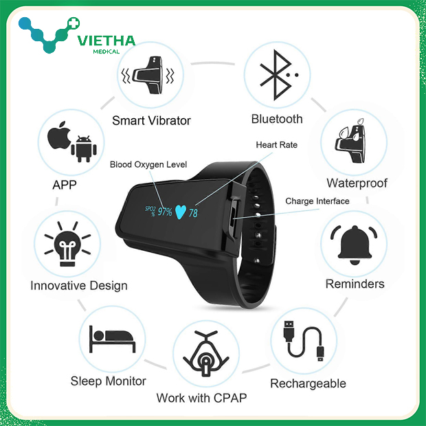 - Thiết bị giúp phát hiện sự sụt giảm oxy ban đêm – dấu hiệu thường gặp ở người ngáy to, khó ngủ, thức giấc giữa đêm.